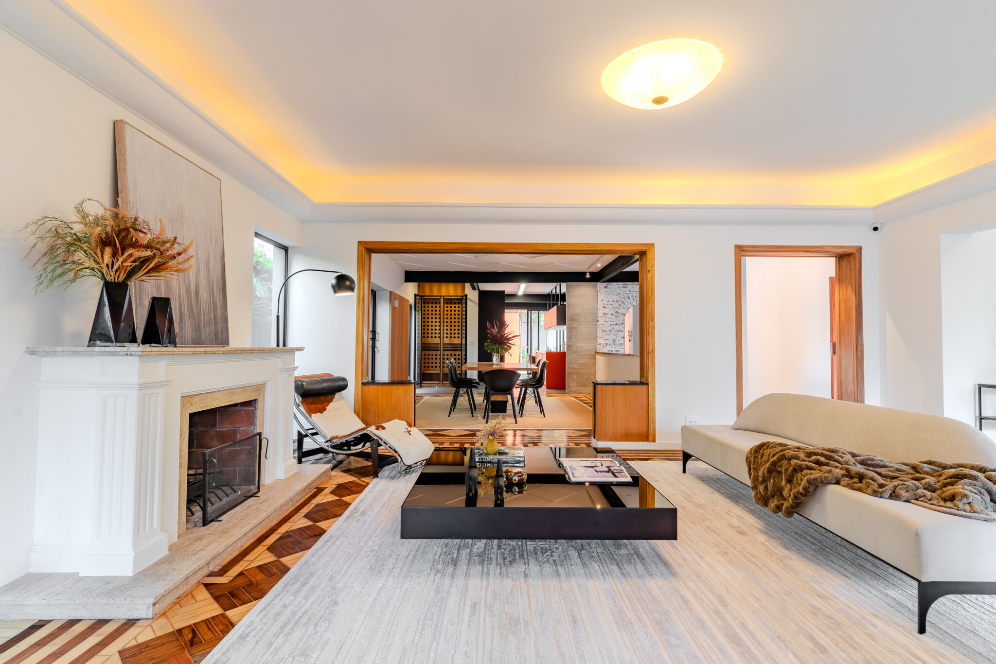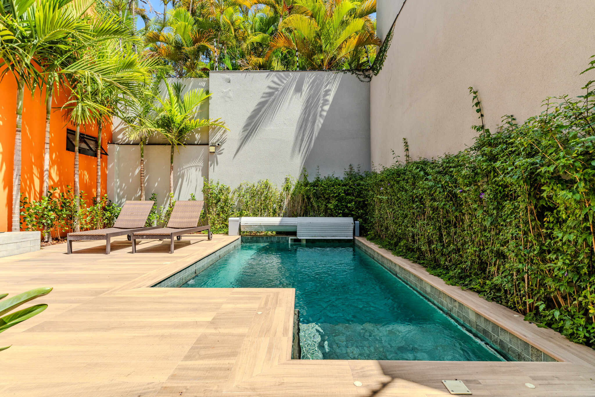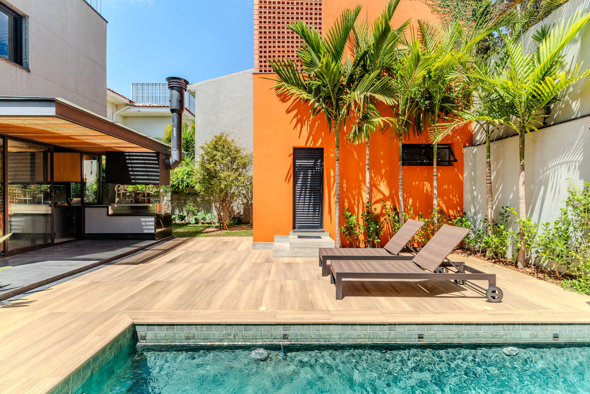 A área útil está distribuída em 3 pavimentos; o térreo com jardim, piscina aquecida, espaço gourmet, cozinha planejada, integrada tanto com a área externa quanto com a área social e living para 3 ambientes.